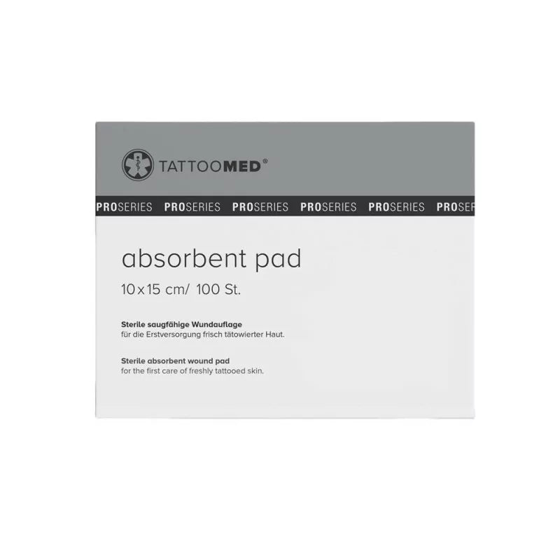TattooMed Absorbent Pad is a professional, sterile wound dressing designed for the crucial initial care of freshly tattooed skin. Available in sizes 10x15cm or 15x20cm, each package contains 100 highly absorbent pads, making it ideal for studios and aftercare routines.