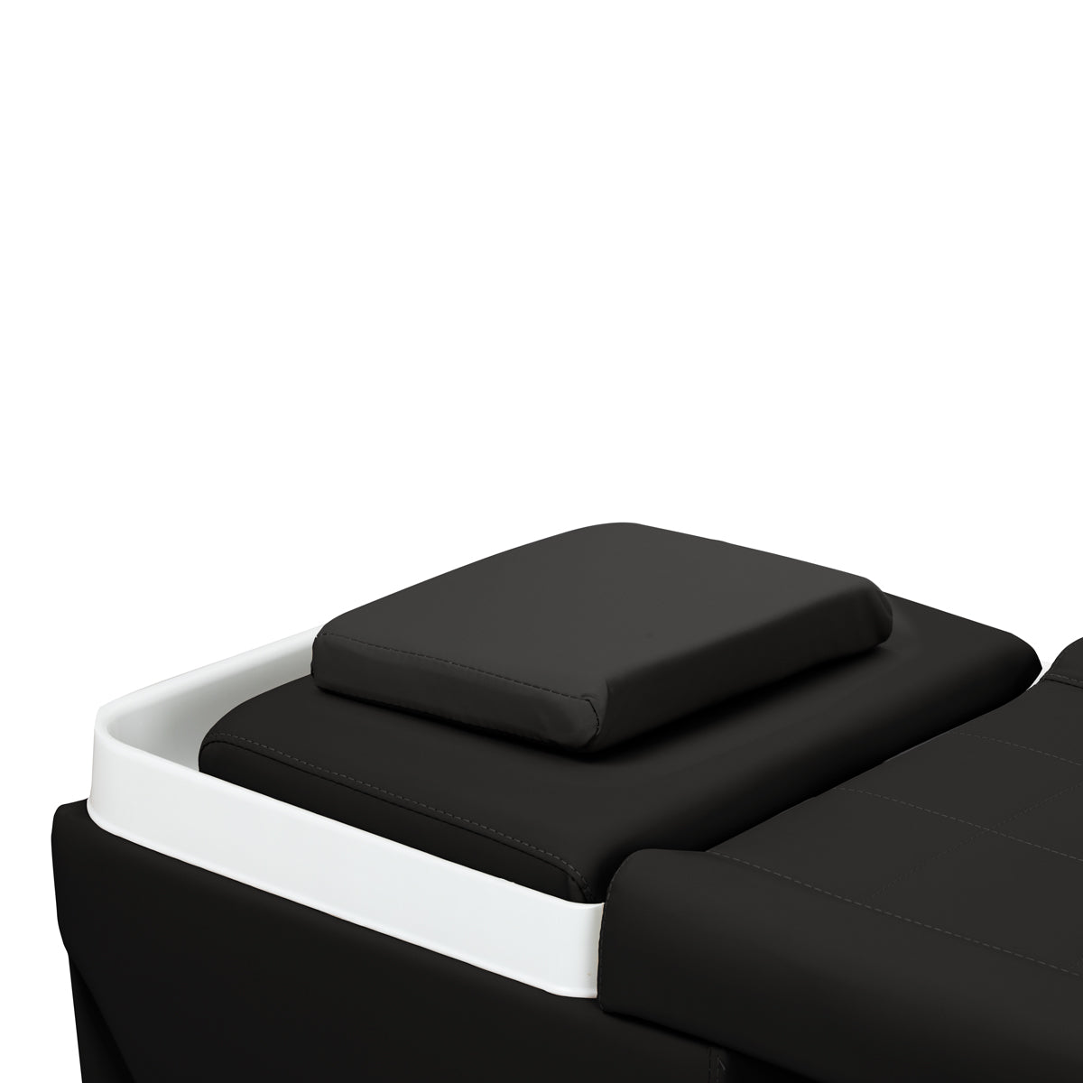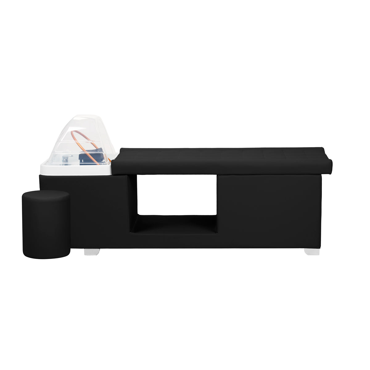 The wash unit is equipped with a mixer tap, allowing for precise adjustment of water temperature to the client's needs. A dedicated space for the shower head improves efficiency, while a chrome-plated plug with a special strainer ensures water flow control and maintains a high level of hygiene. The water connection is located inside the base, behind the fabric, aesthetically concealing the plumbing and giving the entire unit an elegant look. The ergonomically contoured bed ensures comfort during various beauty treatments. A practical pouffe complements the unit, increasing staff comfort and enhancing the functionality of the unit. These features make the wash unit ideal for both hair and SPA salons.