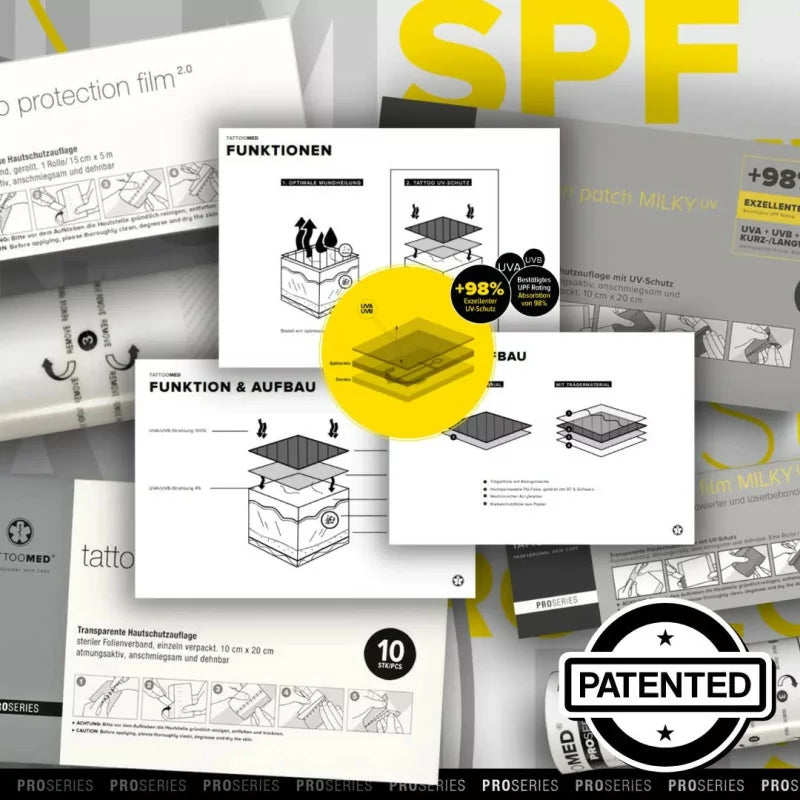 Freshly tattooed skin lacks its natural defense barrier, making it highly susceptible to sunburn and cell damage as soon as you step outside the studio. TattooMed Protection UV Film MILKY acts as a reliable shield, preventing harmful UV radiation from penetrating the skin and supporting optimal healing. The film also protects against contamination, dryness, germs, and textile friction, while maintaining a moist wound climate that accelerates regeneration and reduces scarring.