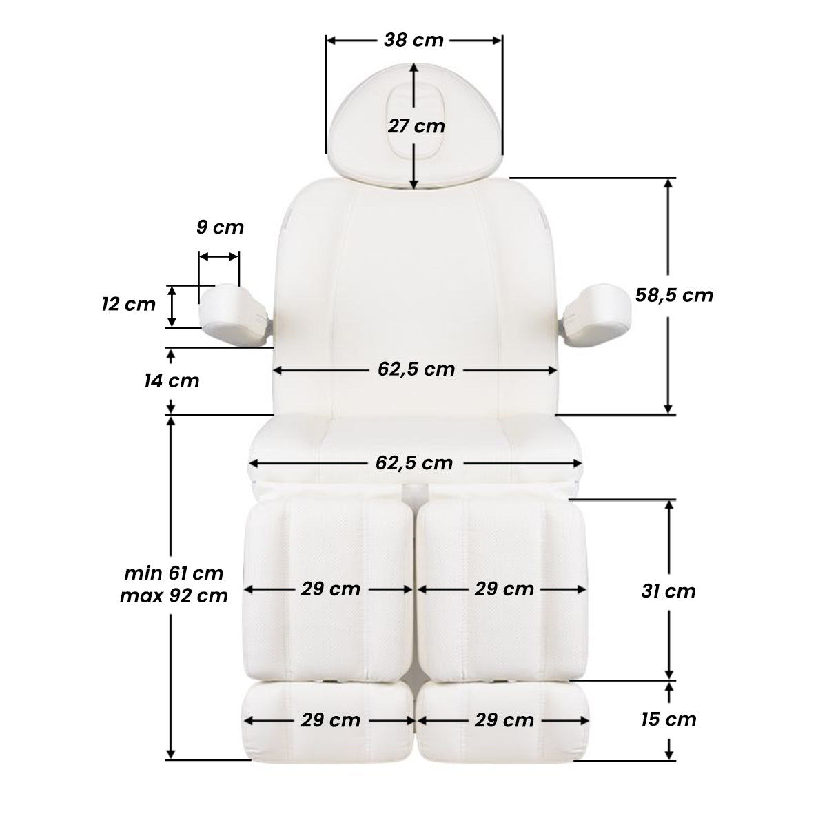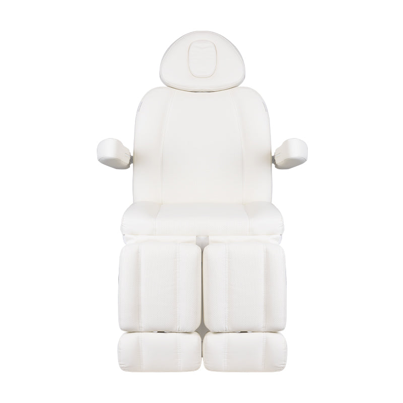 A unique electric cosmetic chair, ideally suited for beauty salons and SPA salons. Thanks to independent actuators, it allows you to adjust the chair in 3 planes by means of a remote control and foot switches, giving the possibility of comfortable pedicure treatments as well as face and body treatments. By using the remote control, we can use the programmed settings and start the HOT function, i.e. heating. The armchair uses perforated upholstery, unheard of in other armchairs, and colored LED illumination of the base.