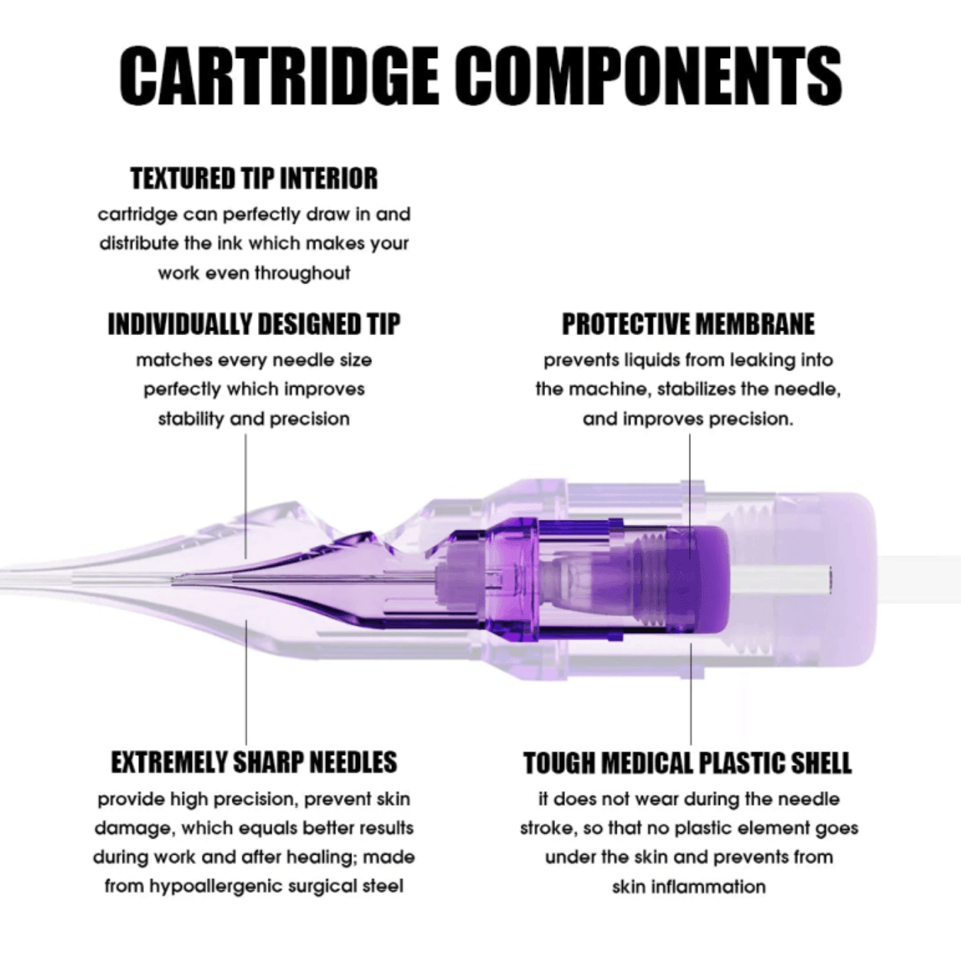 • Tough Medical-Grade Plastic Shell: The cartridges are housed in a tough medical-grade plastic shell that withstands wear during needle strokes, ensuring that no plastic elements enter the skin and minimizing the risk of inflammation.