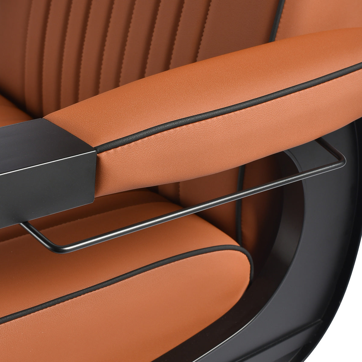 The black, round base ensures stability and durability. The soft, matte synthetic leather upholstery combines comfort with durability. The materials used are moisture-resistant, durable and easy to clean. Stylish stitching and brown-toned upholstery give it a unique character, perfectly complementing the décor of modern barbershops. The combination of the elegant upholstery colour with the black frame and base emphasises the modern, professional look of the chair.