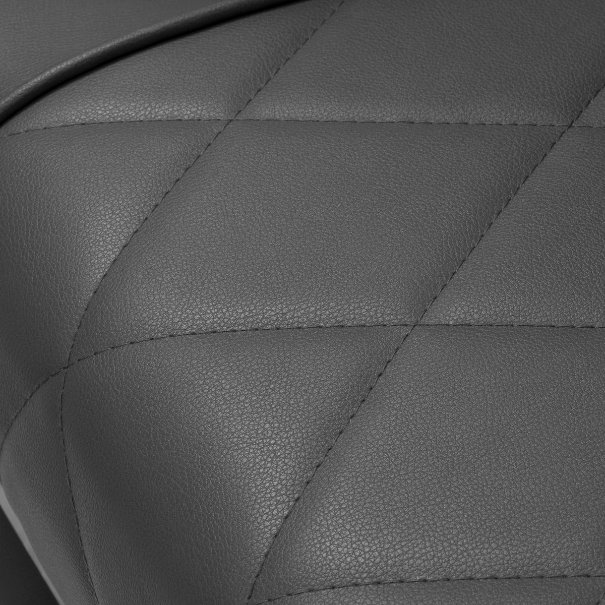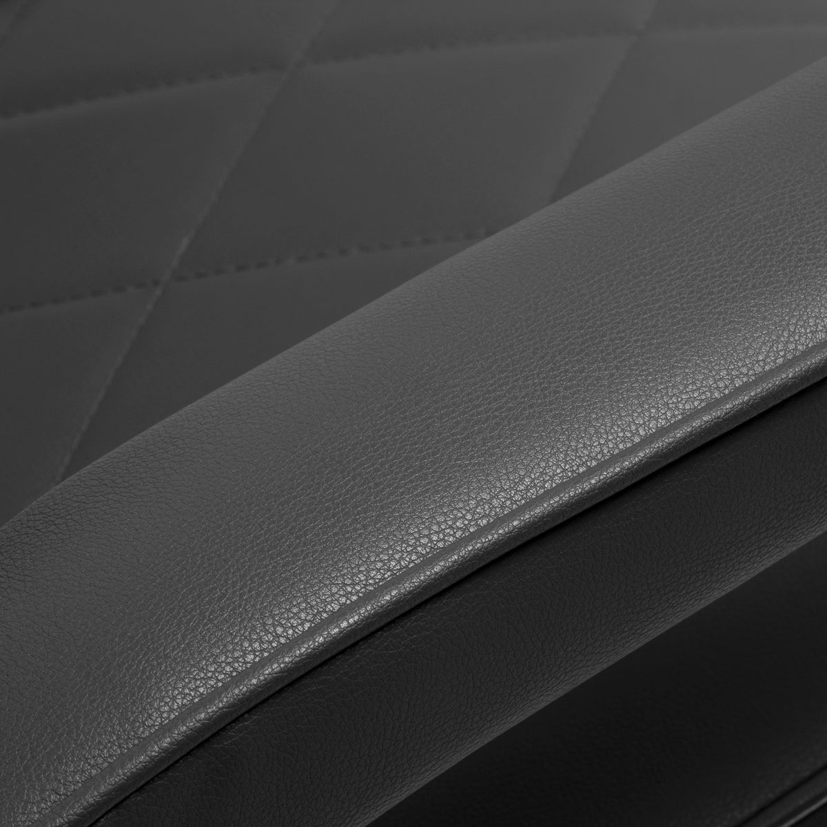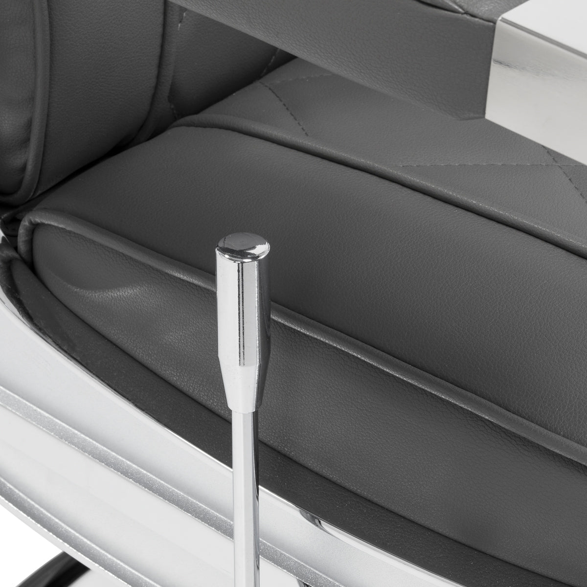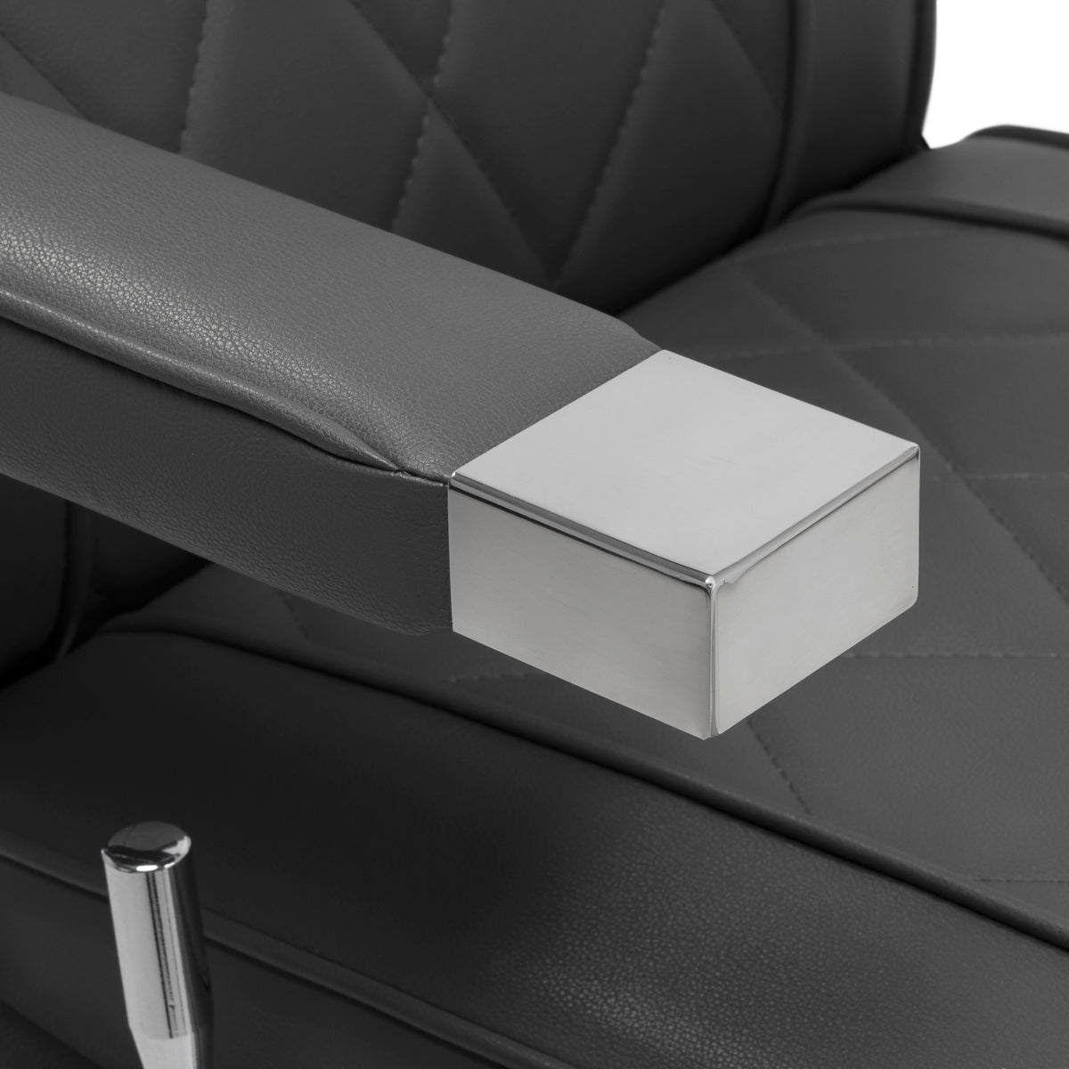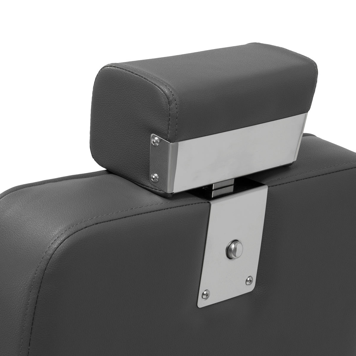 The chair's solid round base construction ensures stability and excellent user comfort. The seat filling, made of deformation-resistant foam, and the upholstery crafted from soft-touch synthetic leather with a matte finish ensure long-lasting durability and comfort during prolonged use. Stylish stitching on the upholstery adds character, evoking automotive design inspirations that enhance its elegant appearance. This feature also makes the chair moisture-resistant, durable, and easy to clean. The upholstery in grey tones gives the chair a unique character, and its minimalist style allows it to blend seamlessly with the decor of any barbershop.
