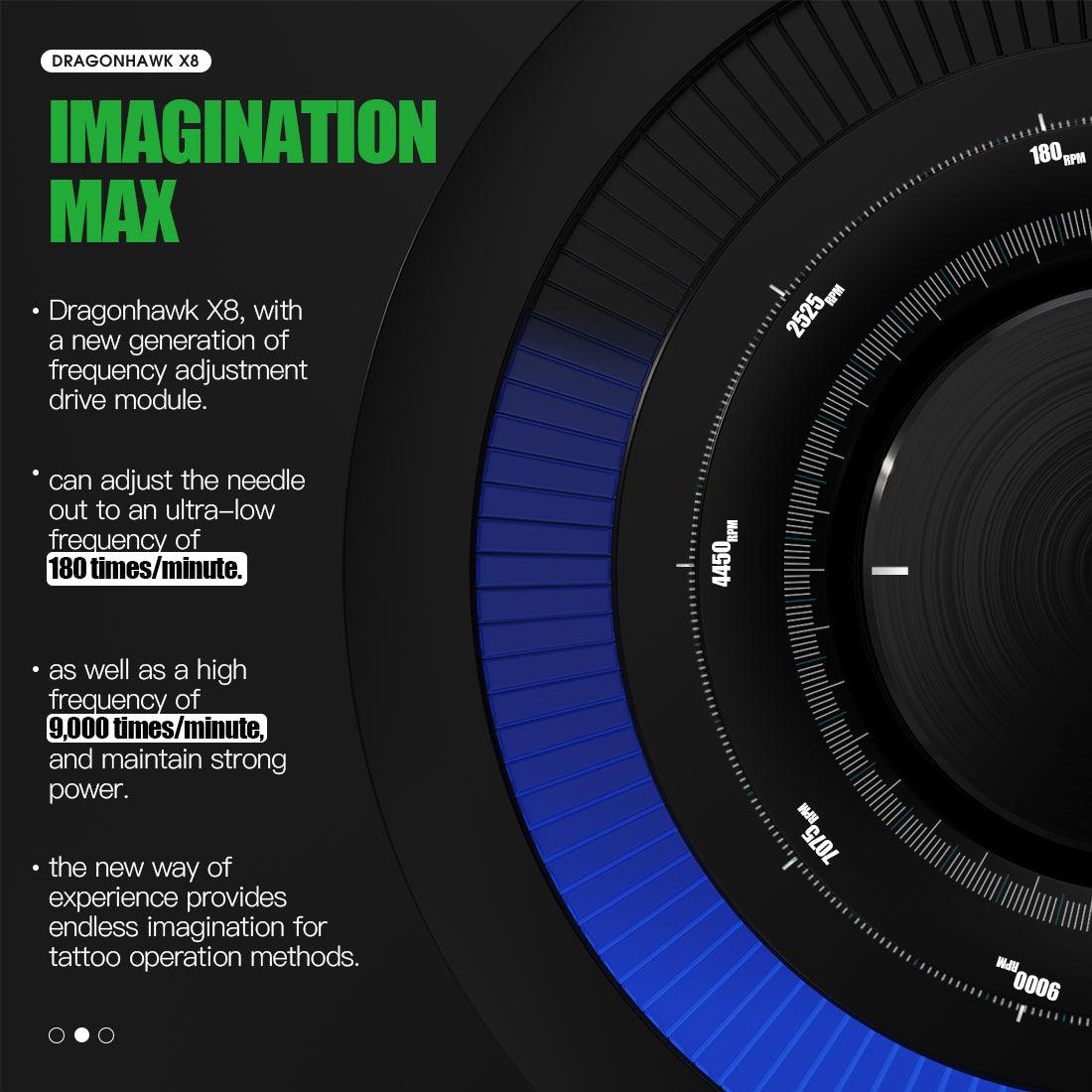 Featuring an advanced 5-speed memory system, the Mast Dragonhawk X8 remembers your preferred settings, including frequency, power, and working time. The adjustable needle speed ranges from a low frequency of 180 times/min to a high frequency of 9000 times/min, ensuring smooth operation and consistent power output for various tattooing styles.