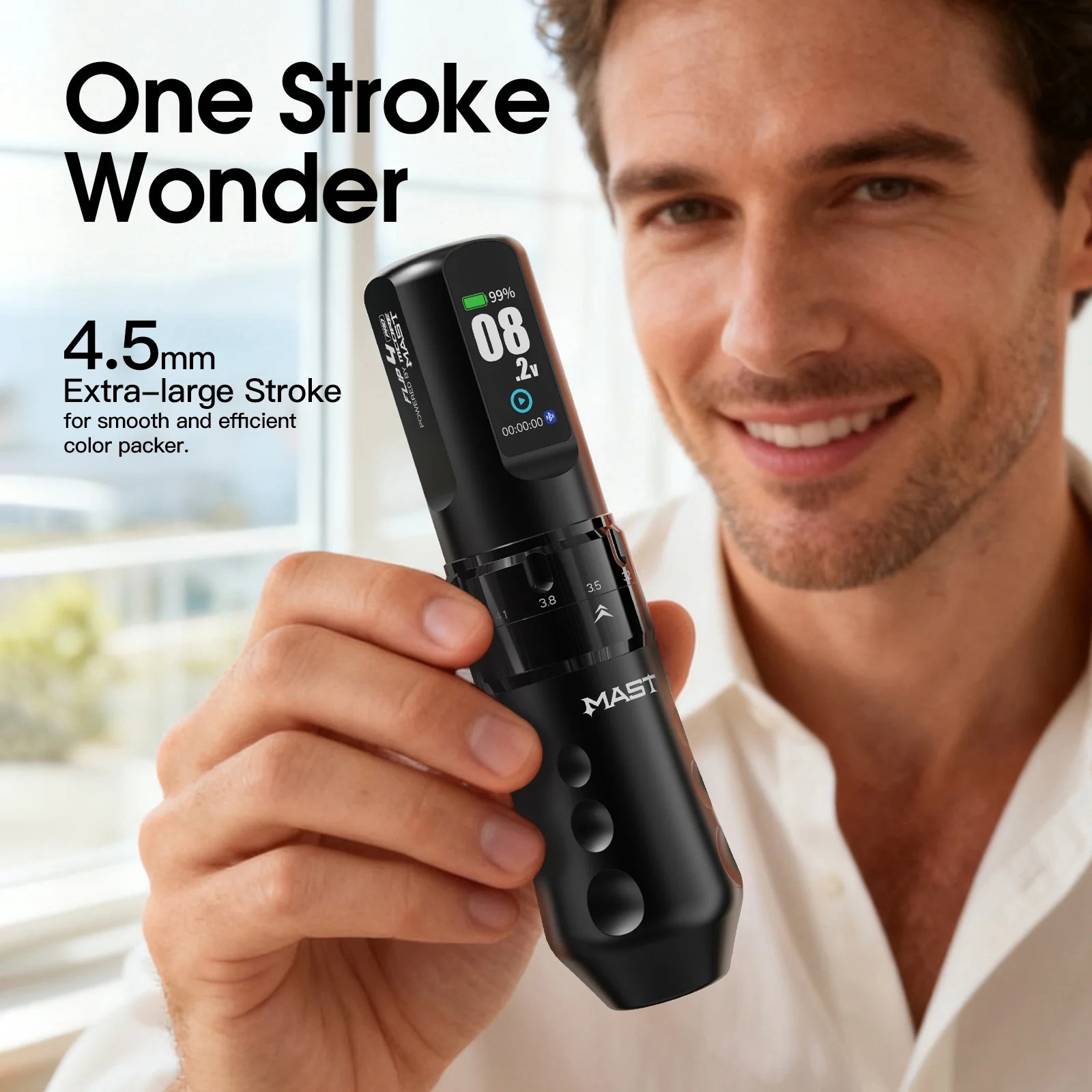 The Mast Flip 4 Pro Wireless Tattoo Machine is designed for artists who require maximum power, adaptability, and control across lining, shading, and color packing. With 7 real stroke length options ranging from 2.5mm to 4.5mm, artists can instantly adjust stroke length via the precision adjustment knob, making the Flip 4 Pro a true all-style tattoo solution.