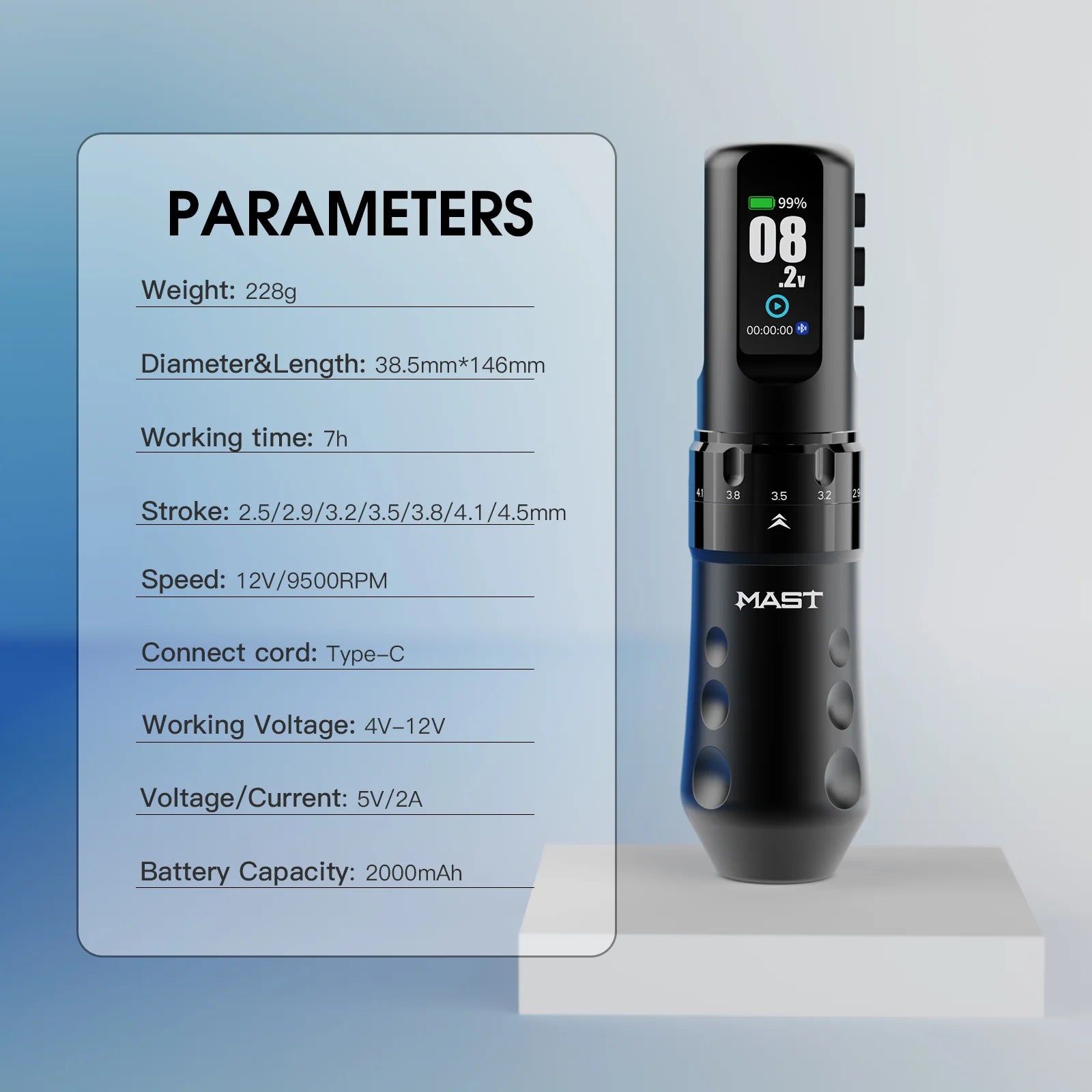Equipped with Mast Safe Tech, the Flip 4 Pro ensures stable output, continuous battery protection, and high-speed charging. At 8V, the machine can operate for up to 7 hours, while a full recharge takes only 1.5 hours via USB-C. Supplied with an extra battery, the system supports long tattoo sessions without downtime, maintaining consistent performance across a 4–12V working range.