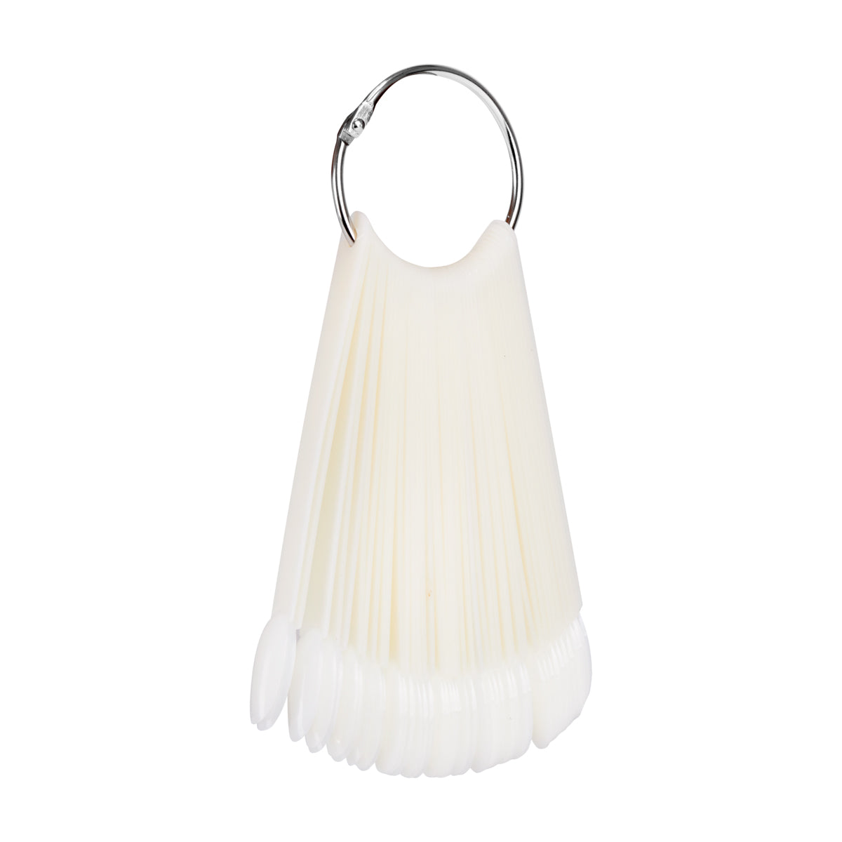 The nail stencil in a milky color allows you to aesthetically present all colors of classic and hybrid varnishes or gels. It consists of 50 individual tips of oval shape and size corresponding to real nails. It is fastened with a practical, detachable wheel, which makes it easy to store the whole thing. Each tip is made of durable plastic.