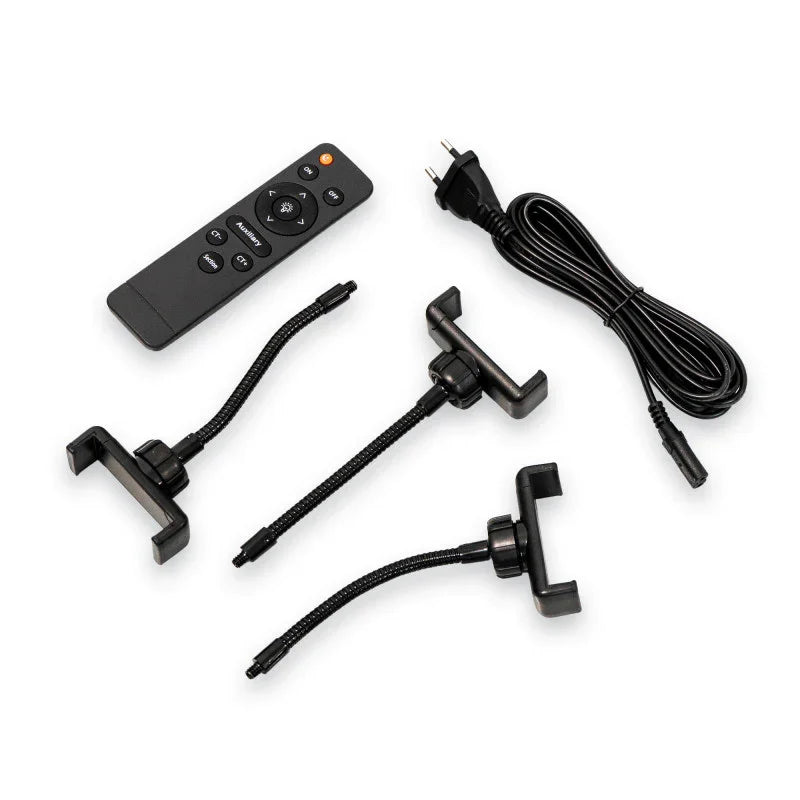 Color temperature is fully adjustable from 2700K (warm) to 6500K (cool), allowing you to match the lighting to skin tone, ink color, or personal preference. Smooth brightness adjustment gives you complete control, while three built-in phone holders let you record, livestream, or take photos from multiple angles simultaneously.